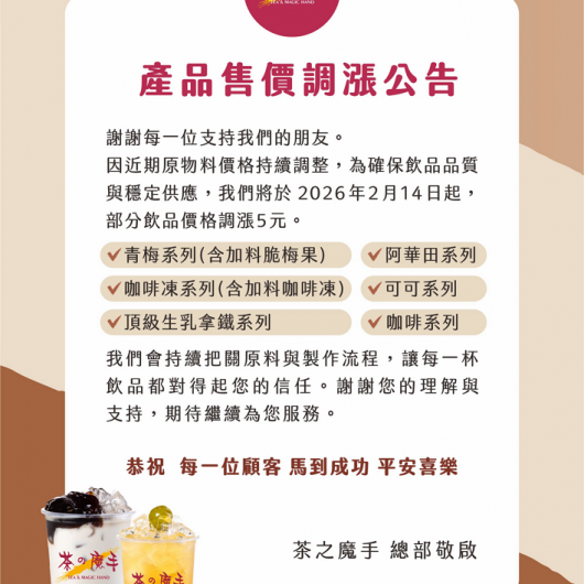 因近期原物料價格持續調整,為確保飲品品質與穩定供應,我們將於206年2月14日起,部份飲品價格調漲5元,我們會持續把關原料與製作流程,讓每一杯飲品都對得起您的信任。謝謝您的理解與支持,期待繼續為您服務。